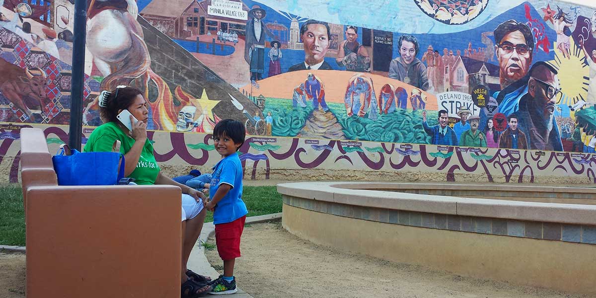 Park visitors near "Gintong Kasaysayan, Gintong Pamana" (A Glorious History, A Golden Legacy), a mural depicting Filipino-American history in Unidad Park in LA's Historic Filipinotown.