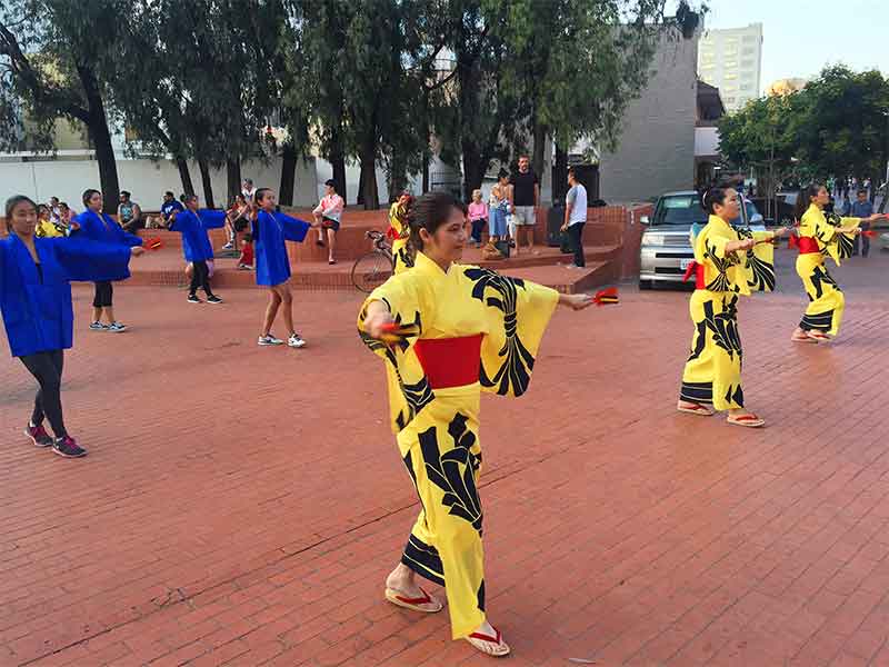 A group performs classical Japanese dances at the Japanese American Cultural and Community Center in preparation for the Nisei Week festival.