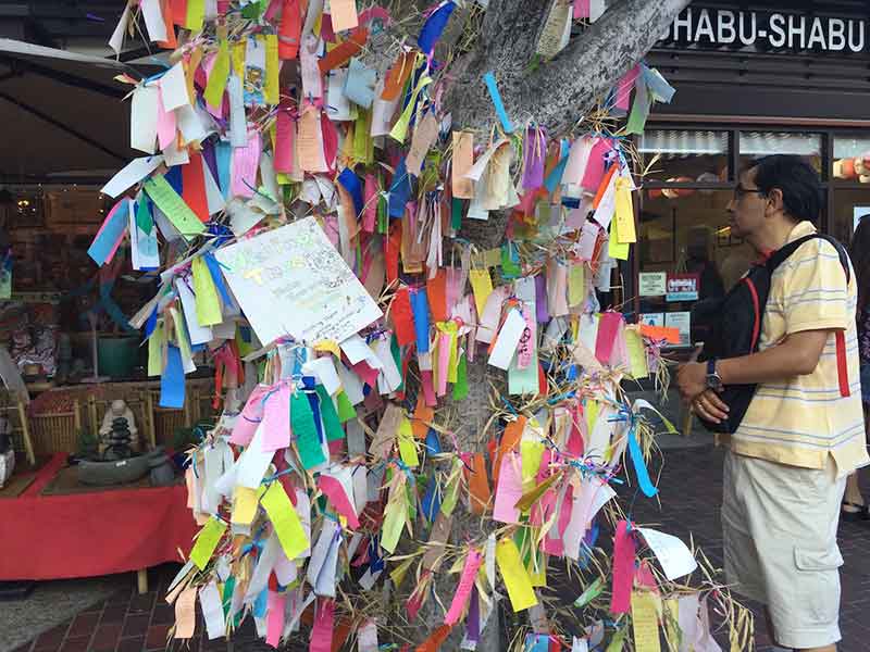 An onlooker reads wishes attached to a tree in front of Blooming Art Gallery where customers can purchase paper for 50 cents to write down their wishes.
