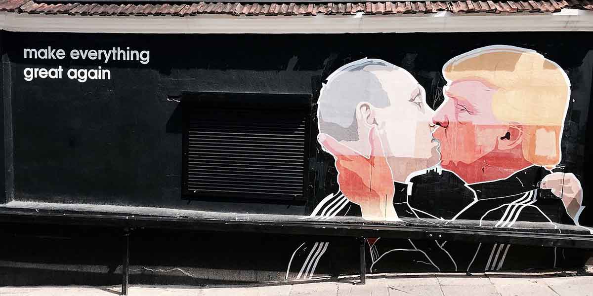 A satirical mural in Vilnius, Lithuania, by the artists Dominykas Čečkauskas and Mindaugas Bonanu, depicting Trump and Putin locked in a warm embrace. (Photo by Rasagri / CC BY-SA 4.0.)