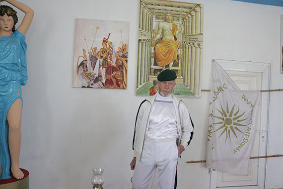 Aristotle Kakogeorgiou stands in front of his art in one of his temples.