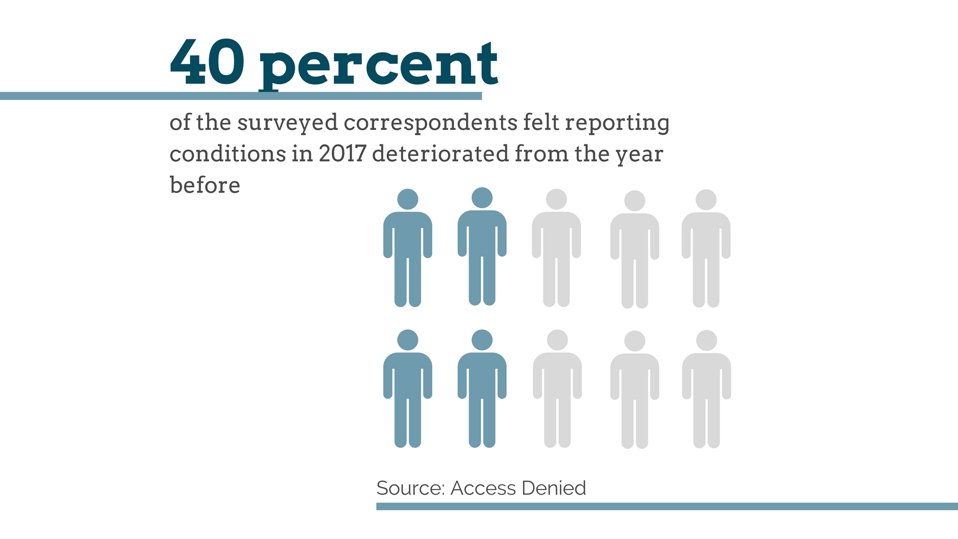 According to Access Denied, a Foreign Correspondents’ Club of China (FCCC) report on working conditions in 2017, 40 percent of respondents felt reporting conditions in 2017 deteriorated from the year before, compared to 29 percent in 2016. The report also shows that correspondents reported higher levels of concern about surveillance and invasion of privacy. The FCCC estimated that there are currently 600 foreign correspondents in China, a drastic decrease from 866 in 2009, according to the former chief spokesman for China’s Ministry of Foreign Affairs, Jianchao Liu. Hutzler said that it is more difficult to recruit reporters to come to China because of the pollution and the Great Firewall, a system that prevents access to websites deemed undesirable from the Chinese government.