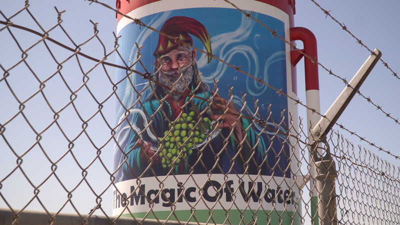 A water tank south of Bakersfield professes the magic of water. (Jonathan Horwitz)