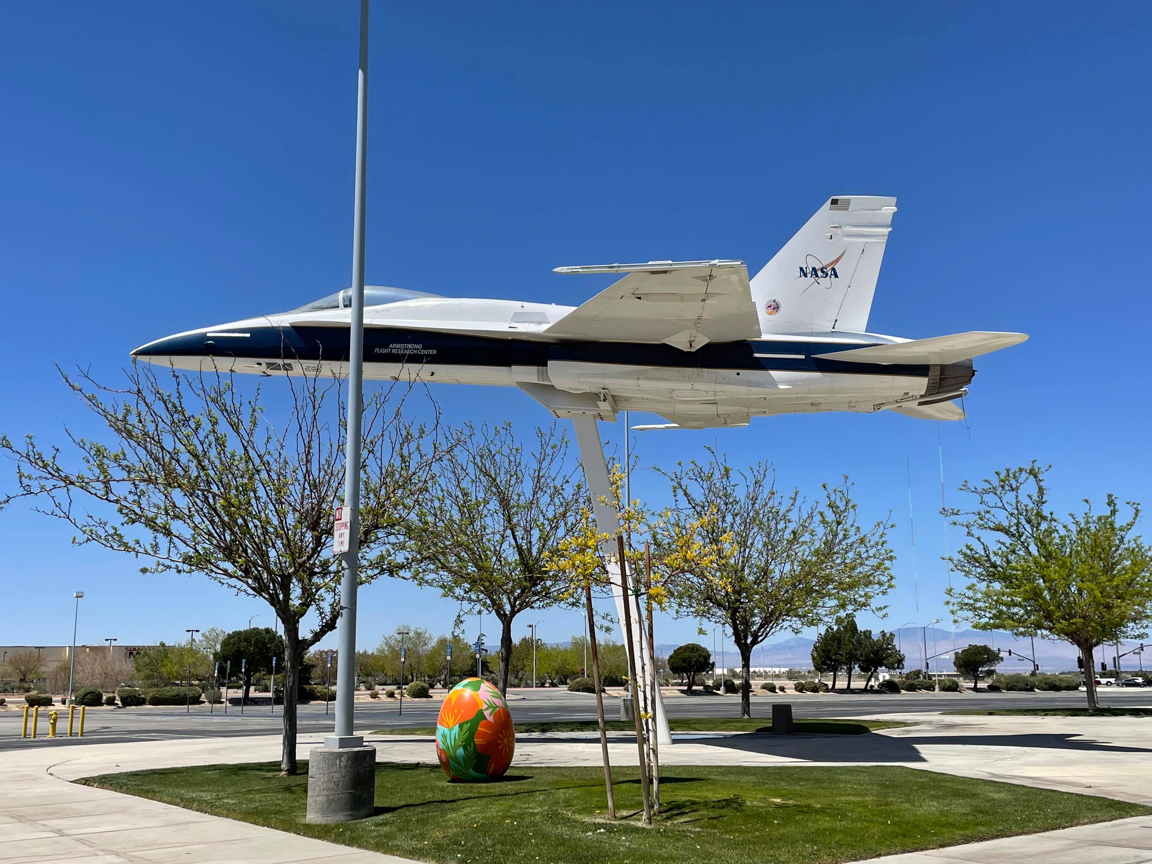 A retired NASA F/A-18A Hornet aircraft that serves as an iconic landmark in front of "The Hangar," once home to the Lancaster JetHawks. Photo by Tony Quach.