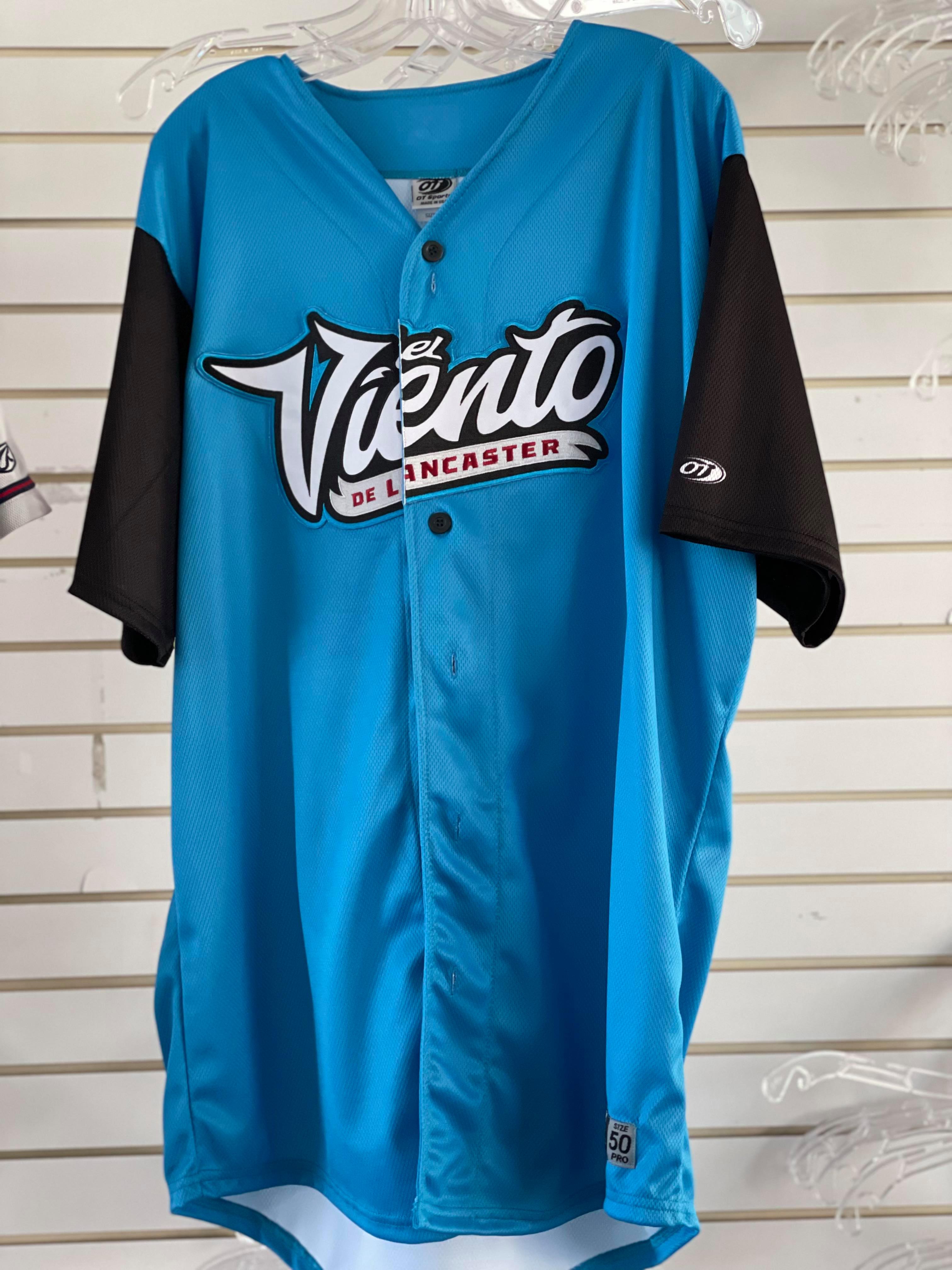 The JetHawks' "El Viento" jersey. For 10 games the JetHawks became "El Viento de Lancaster" on Friday Nights, as they participated in MiLB's Copa de la Diversión Initiative. Photo by Tony Quach.