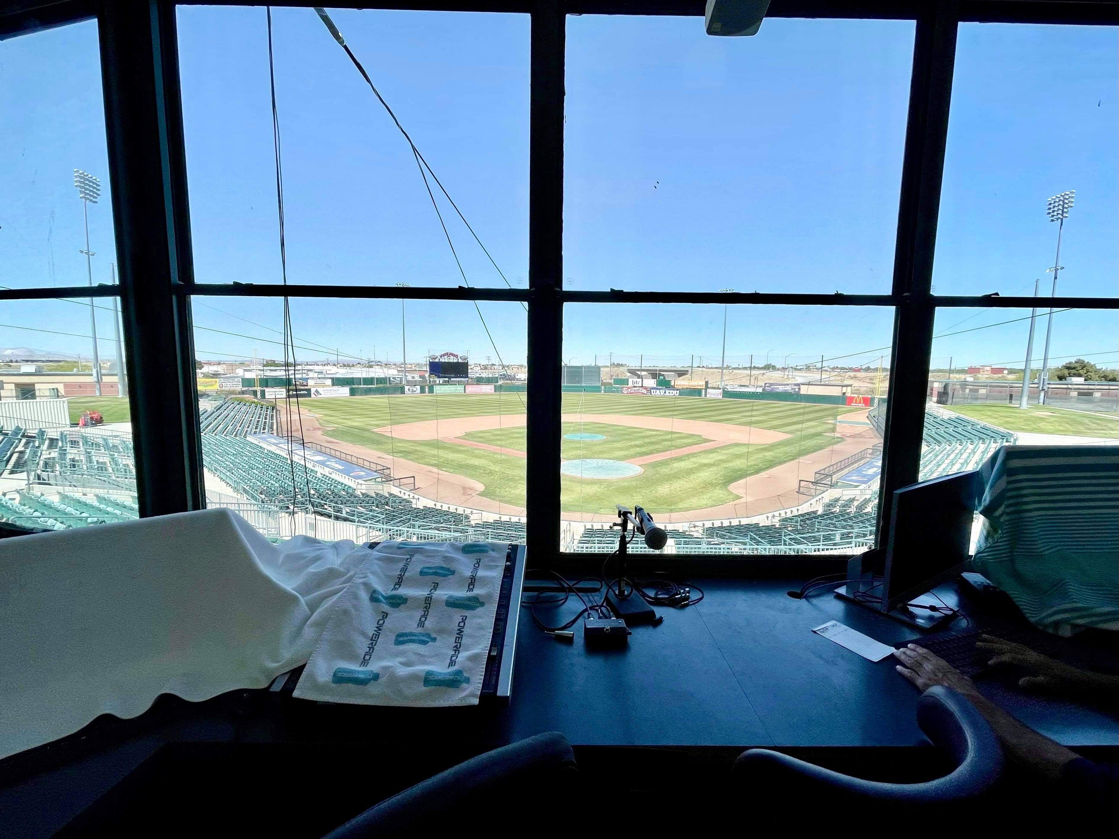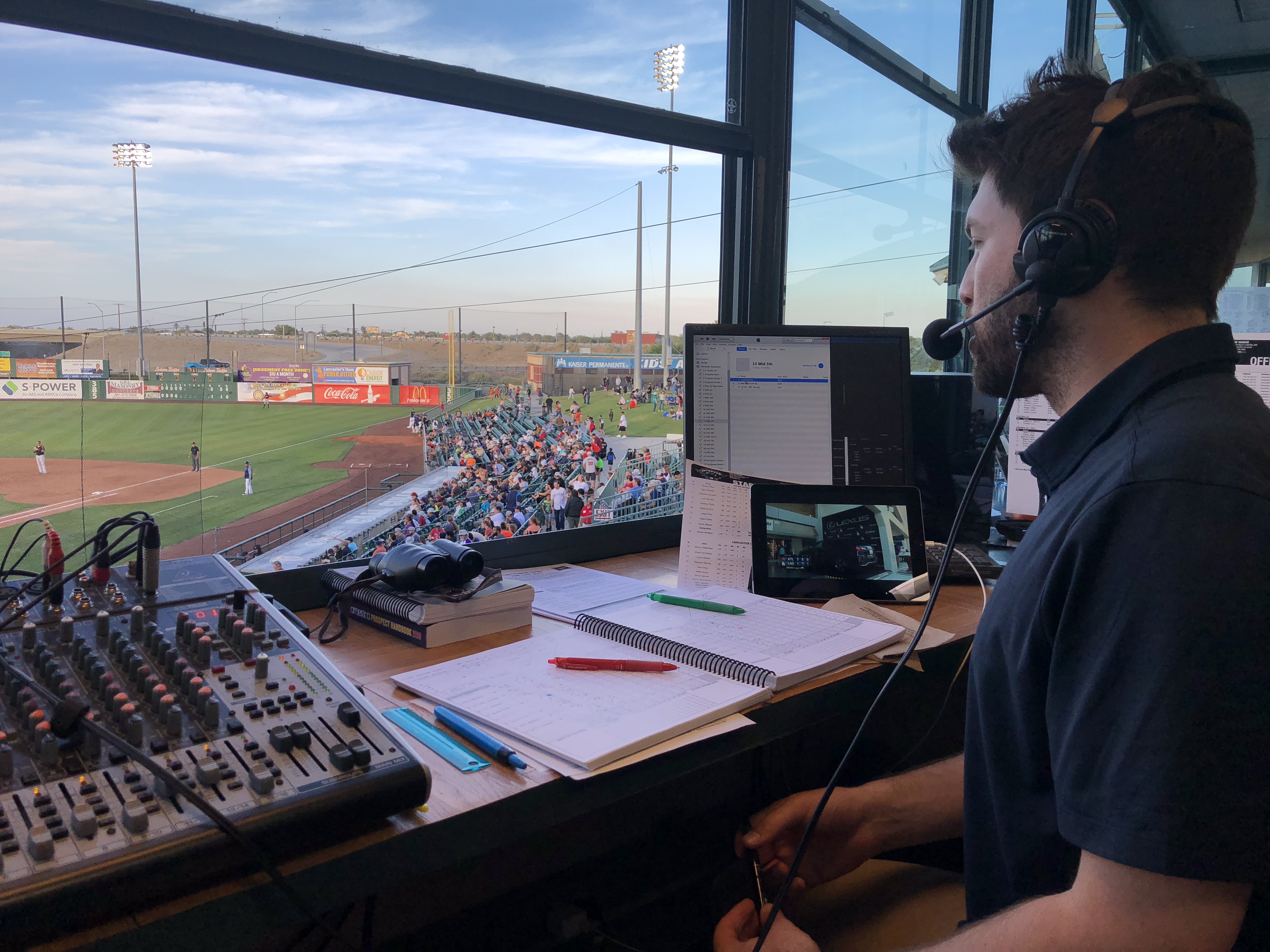 Jason Schwartz calling a game for the Lancaster JetHawks. As the director of broadcasting and media relations, this was his longest-tenured job. Photo courtesy Jason Scwartz.