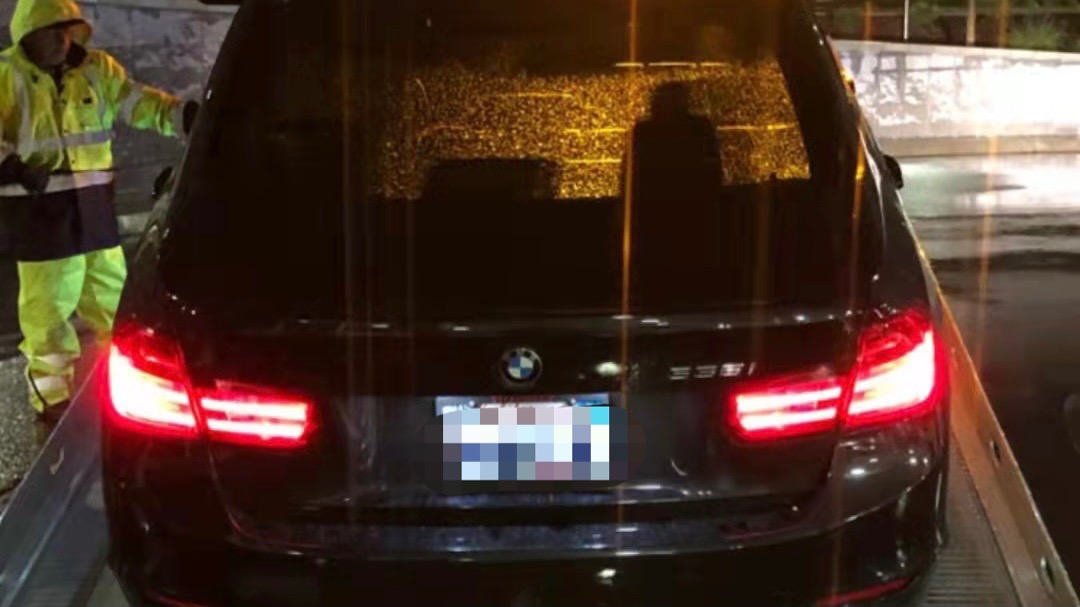 Wang's BMW 335i blowed the charge pipe and broke down on the road in a rainy night of 2019. The car was going to a tow truck. (Photo courtesy of Shi Wang).
